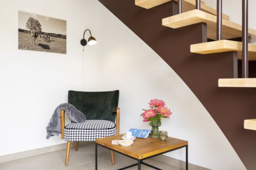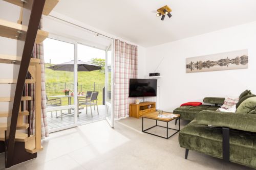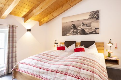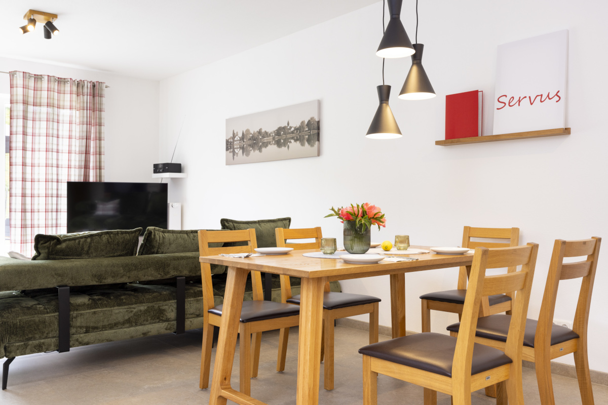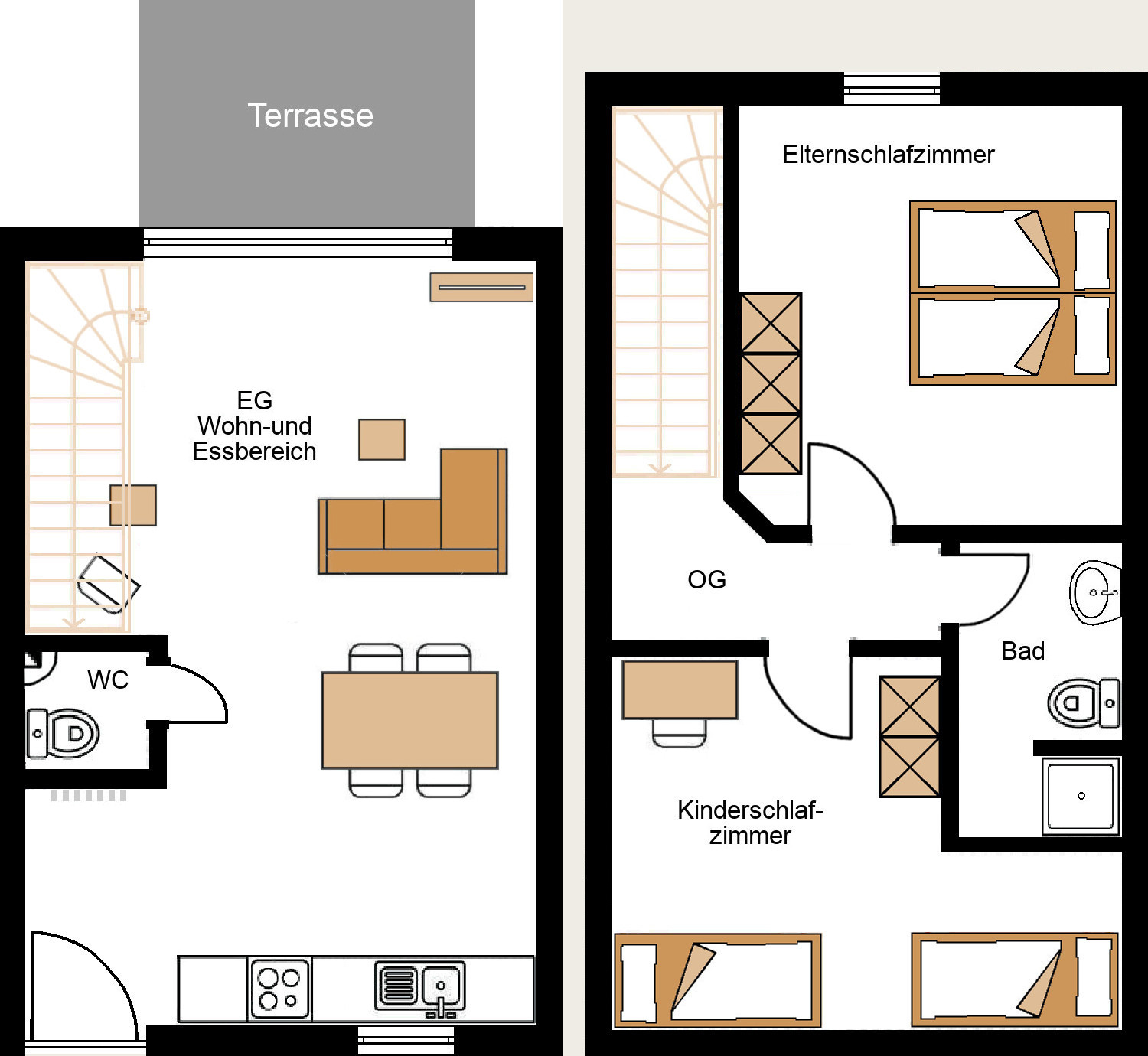 Im Erdgeschoss befindet sich der Wohn- und Essbereich, im Obergeschoss die geräumigen Schlafzimmer, mit dem dazugehörigen Badezimmer. Im ersten Schlafzimmer befindet sich ein Doppelbett (200cm x 180cm), das zweite Schlafzimmer ist mit zwei Einzelbetten ausgestattet. Die Ferienwohnung beinhaltet eine komplett eingerichtete Küche mit einem 50Zoll Smart-TV und WLAN. Selbstverständlich stellen wir Bettwäsche, Hand- und Geschirrtücher und bei Bedarf Kleinkindausstattung zur Verfügung.