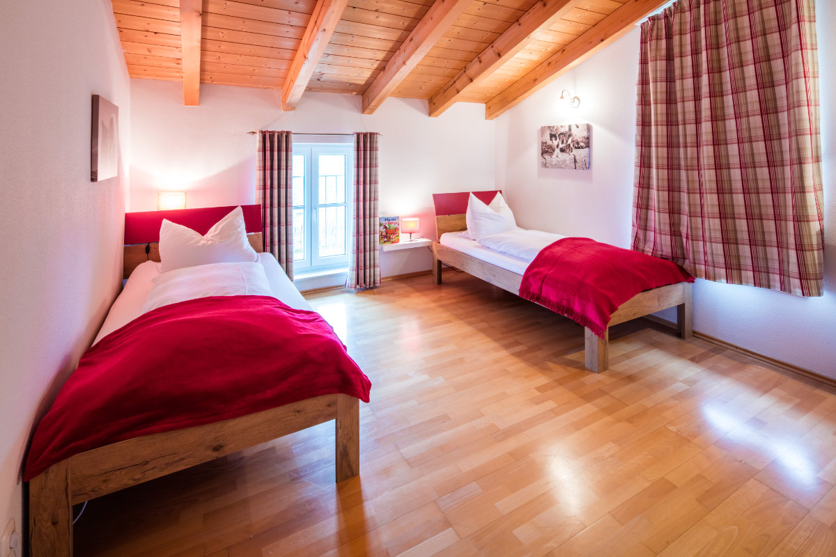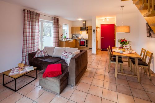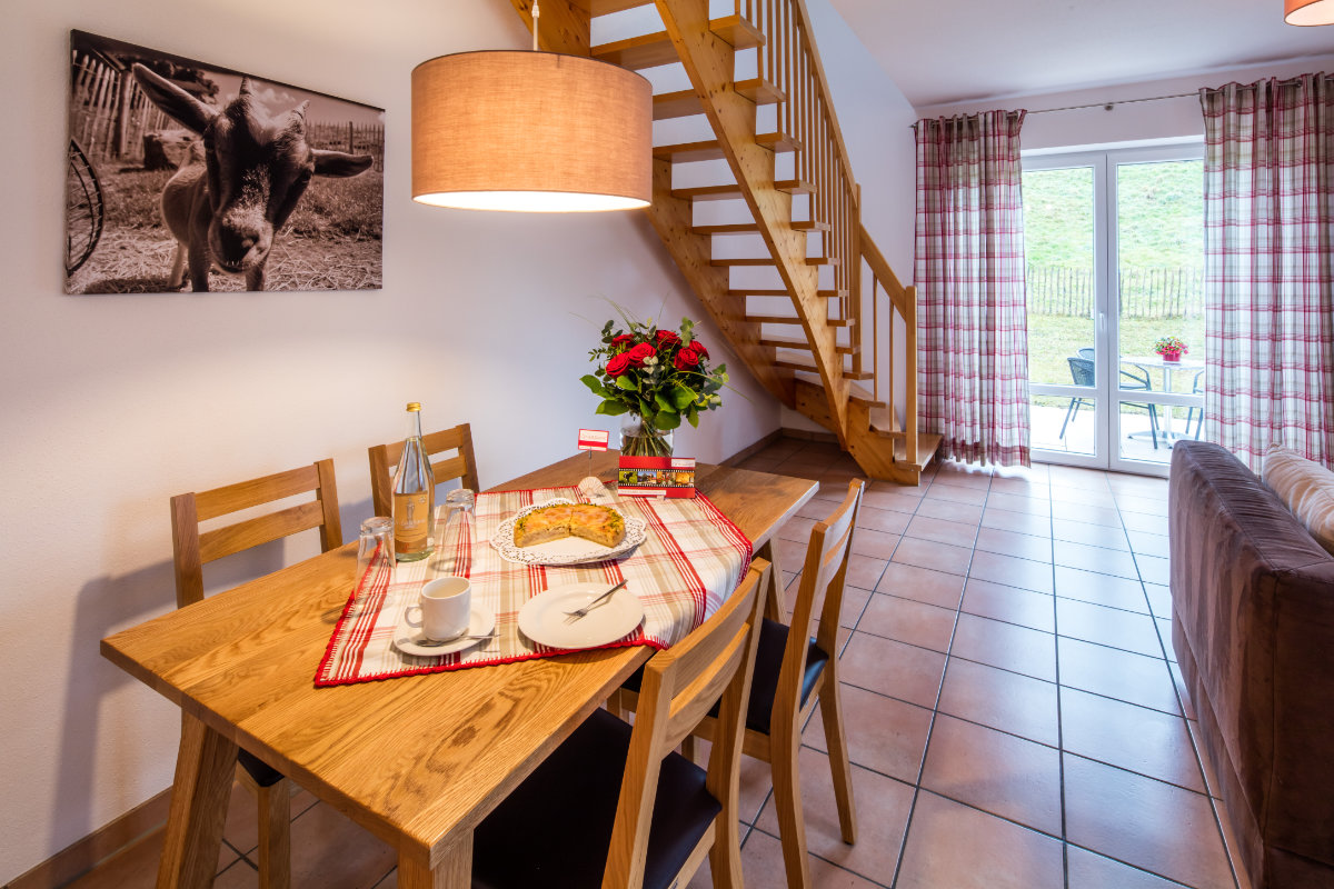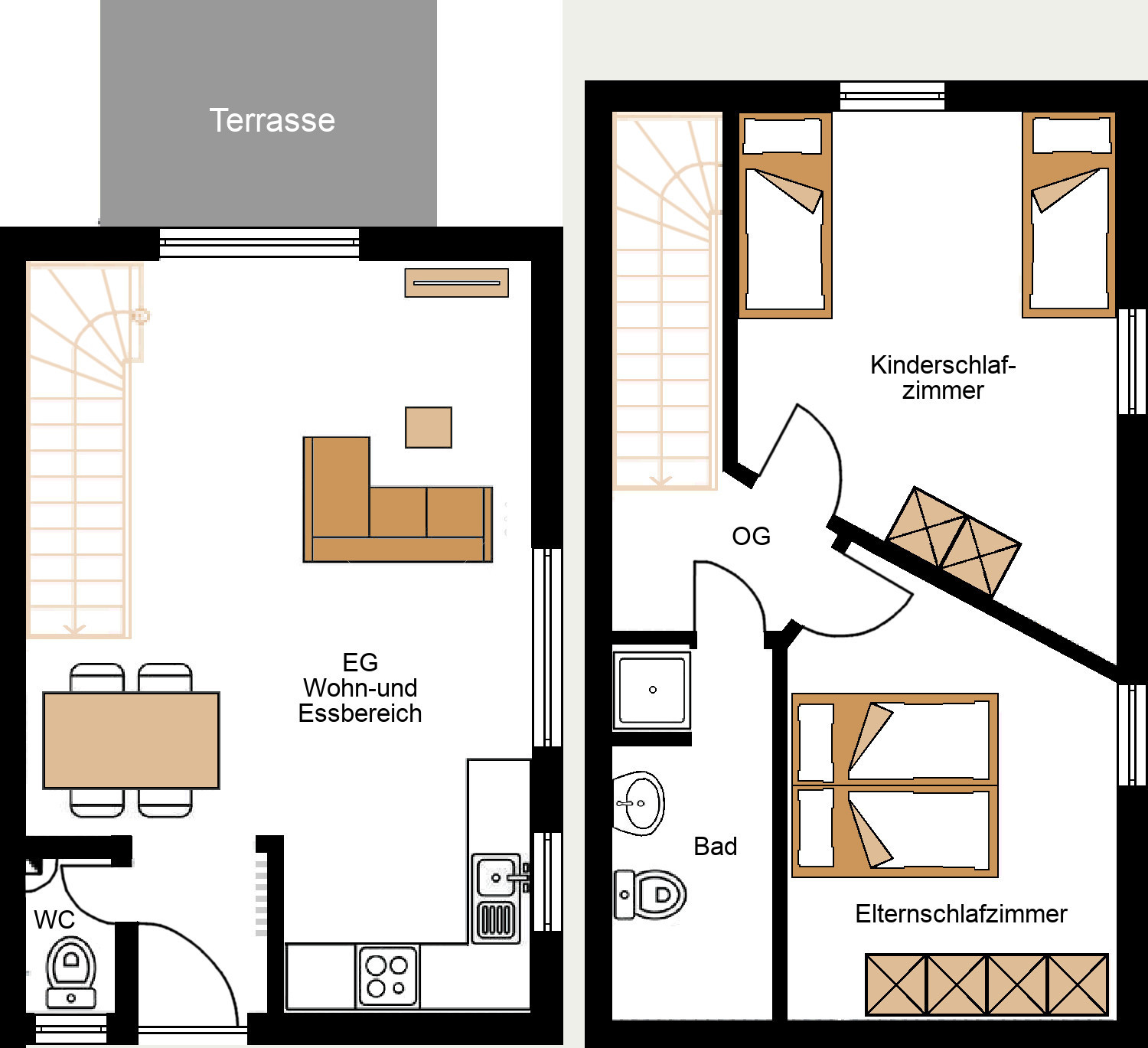 Im Erdgeschoss befindet sich der Wohn- und Essbereich, im Obergeschoss die geräumigen Schlafzimmer, mit dem dazugehörigen Badezimmer. Im ersten Schlafzimmer befindet sich ein Doppelbett (200cm x 180cm), das zweite Schlafzimmer ist mit zwei Einzelbetten ausgestattet. Die Ferienwohnung beinhaltet eine komplett eingerichtete Küche mit Sat-TV und WLAN. Selbstverständlich stellen wir Bettwäsche, Hand- und Geschirrtücher und bei Bedarf Kleinkindausstattung zur Verfügung.